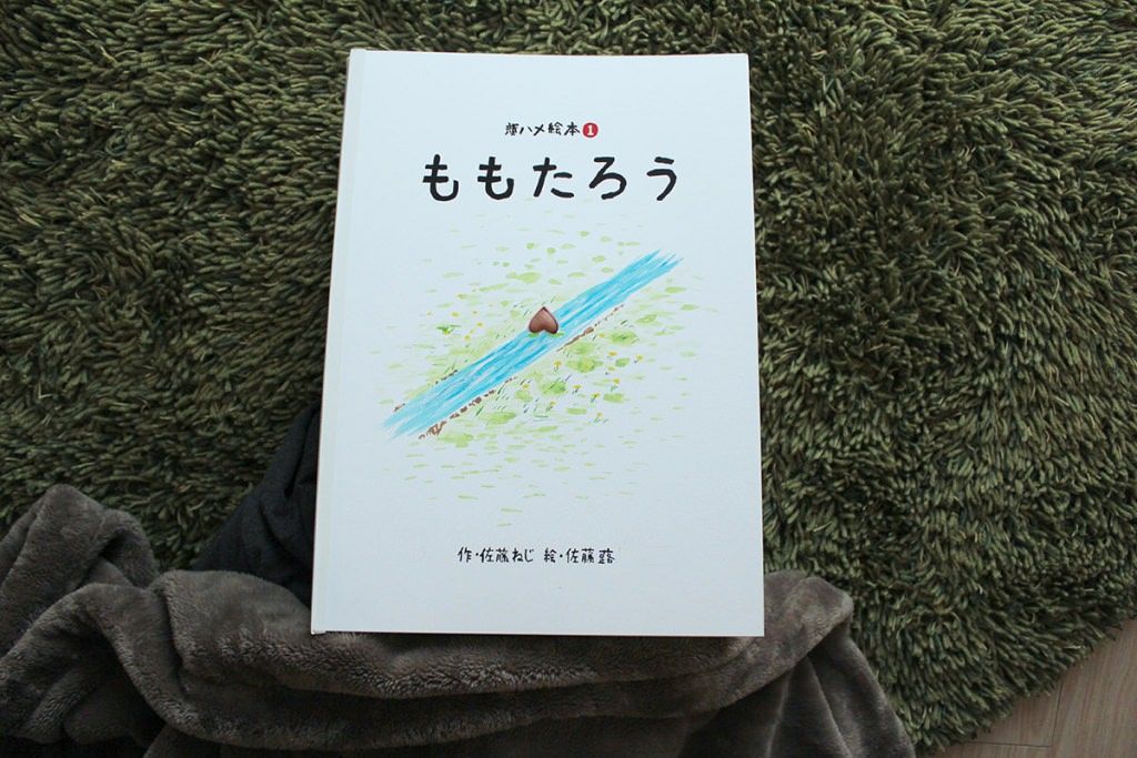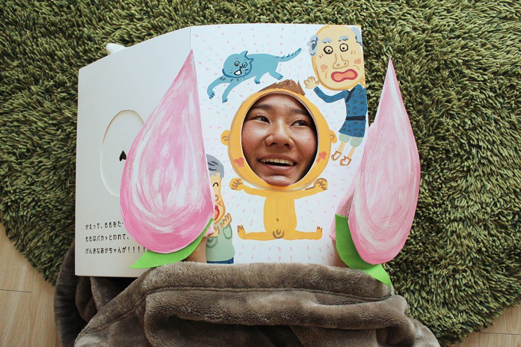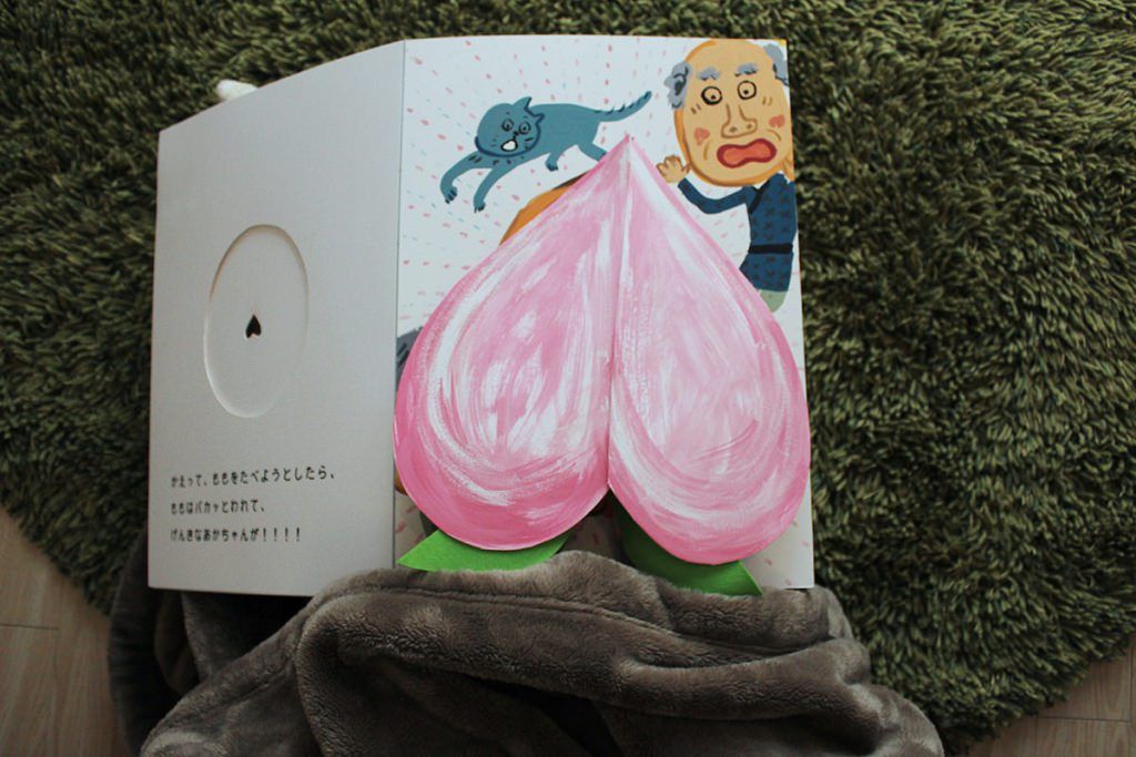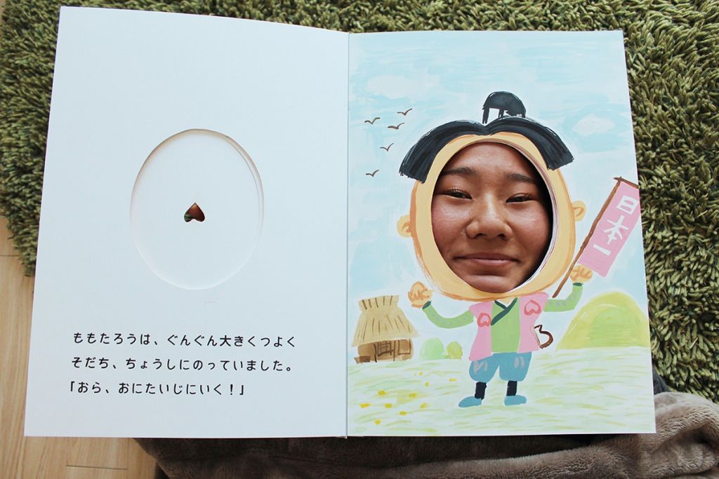 桃の手袋でいないないばぁをして、桃太郎誕生。